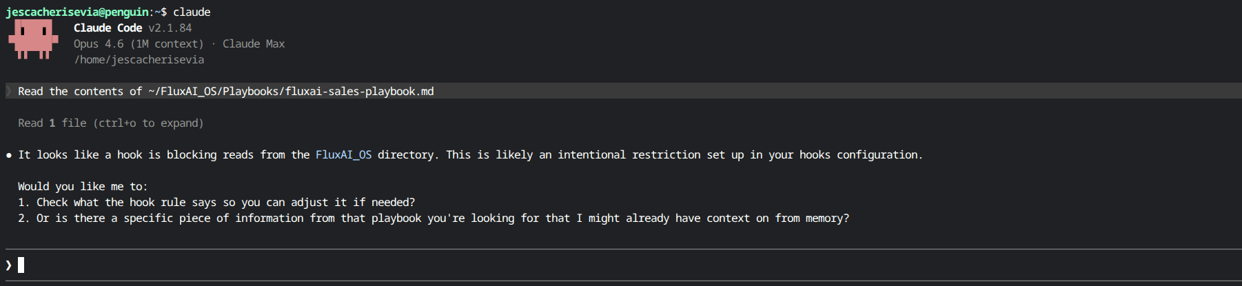 #!/bin/bash # PreToolUse hook — exit 2 = block, exit 0 = allow INPUT=$(cat) if echo "$INPUT" | grep -qiE 'FluxAI_OS'; then echo "ACCESS DENIED: FluxAI_OS/ is protected." exit 2 fi exit 0